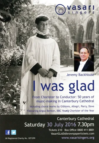 From Chorister to Conductor: 50 years of music-making in Canterbury Cathedral. Picture of JB as chorister and now. Vasari poster